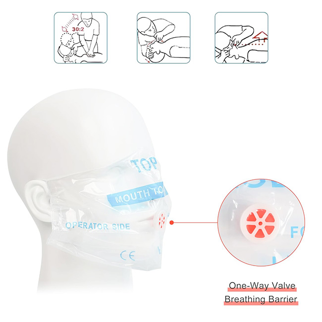 La máscara de RCP con barrera respiratoria está diseñada para ofrecer una solución práctica, higiénica y confiable durante emergencias médicas. Su lámina transparente cubre completamente boca y nariz del paciente, mientras que la válvula unidireccional central permite el paso del aire en una sola dirección, ayudando a prevenir la exposición a saliva, vómitos u otros fluidos.