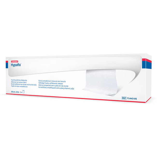 Leukoplast® Hypafix® es una cinta adhesiva de retención fabricada en tejido no tejido, diseñada para la fijación de apósitos en áreas extensas del cuerpo. Su diseño permite cortarse a la medida requerida, facilitando una aplicación práctica y eficiente en entornos hospitalarios, clínicas y atención domiciliaria.